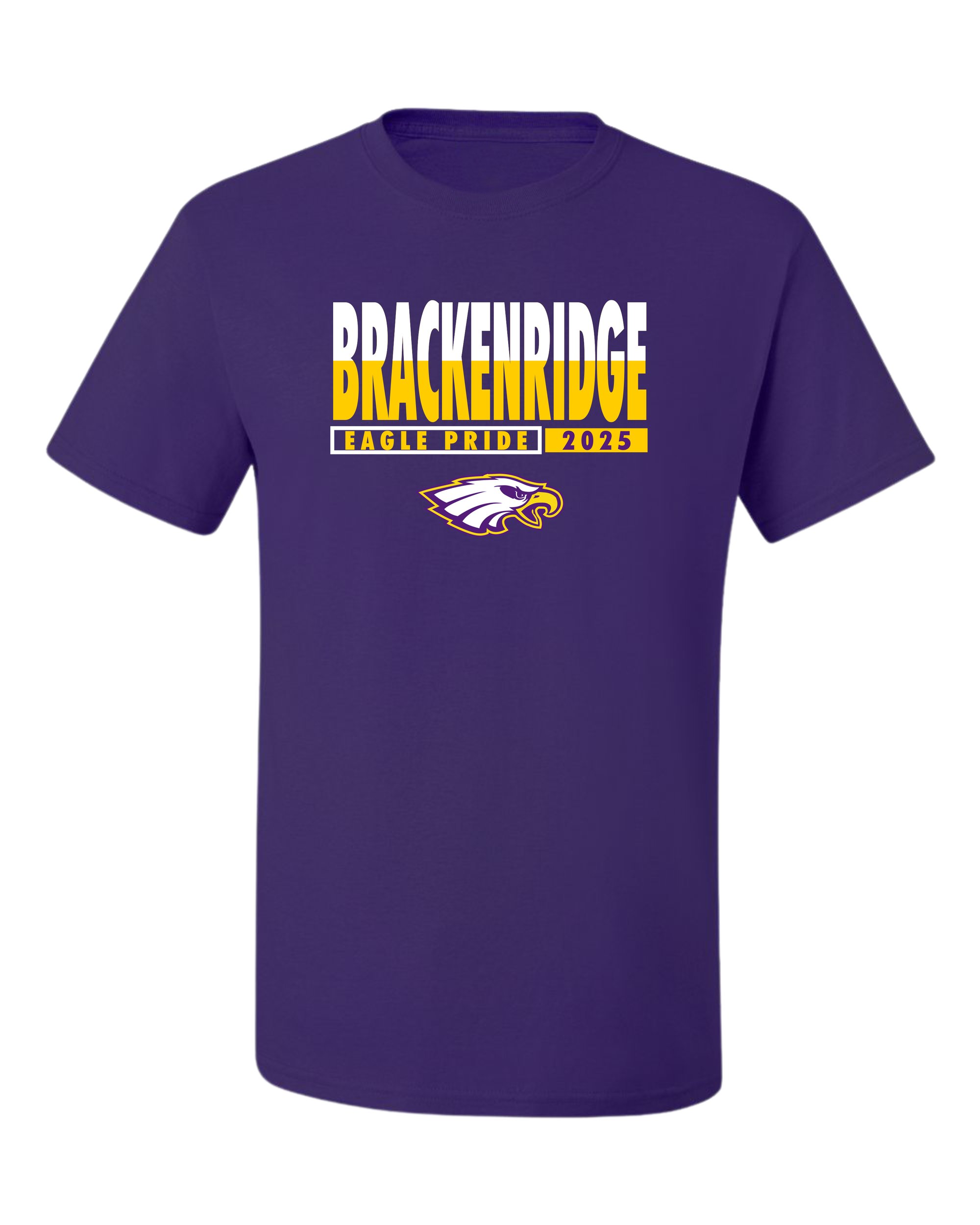 Show your school pride with this Brackenridge HS purple short sleeve T-shirt featuring a bold eagle graphic and the "Brackenridge Spirit Pride" logo. Perfect for school spirit and supporters, this comfortable purple shirt is a must-have for the 25-26 school year